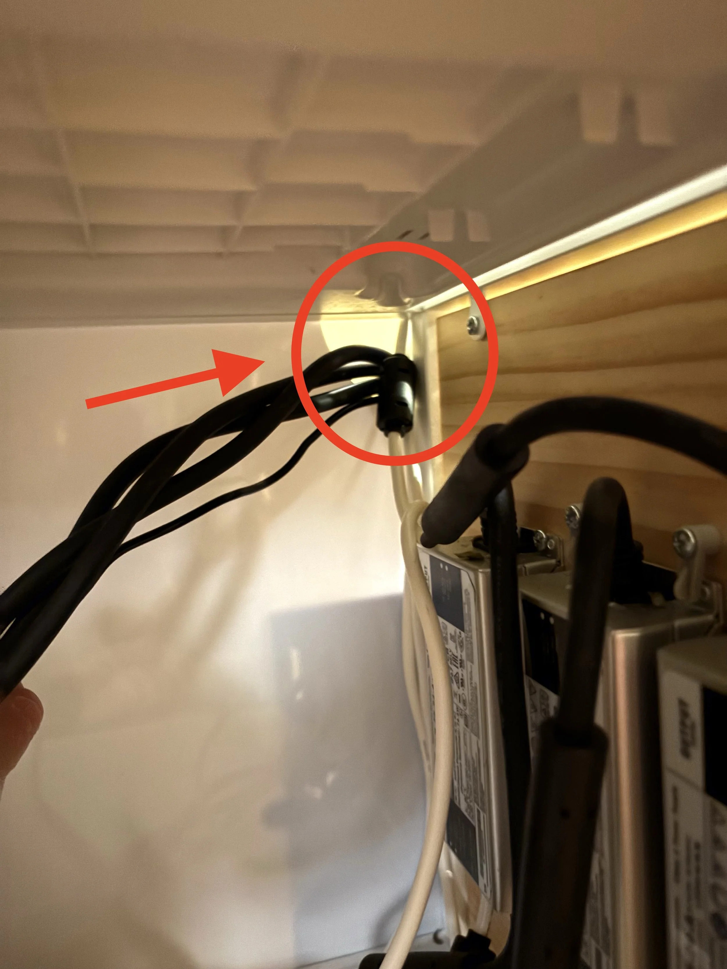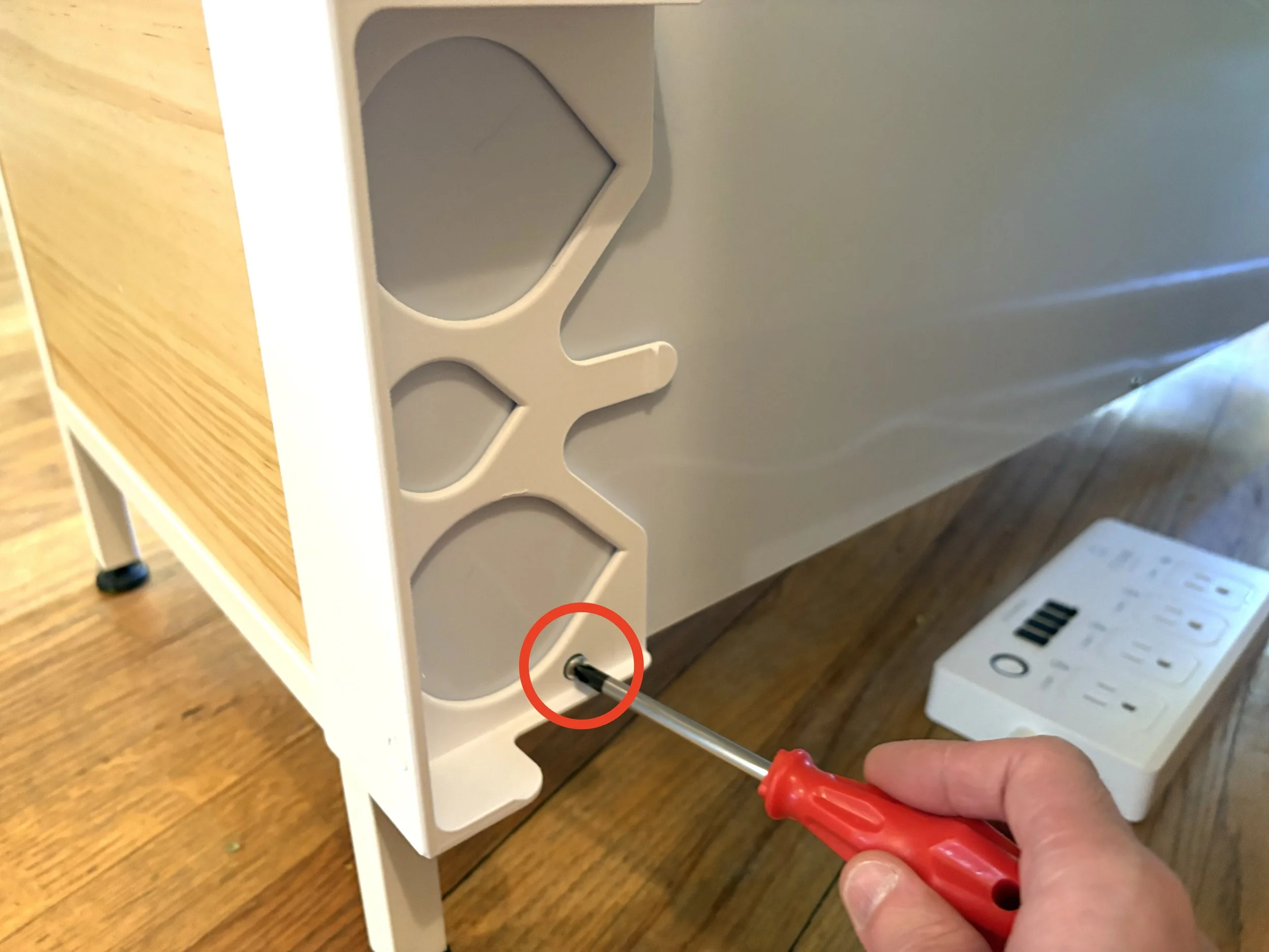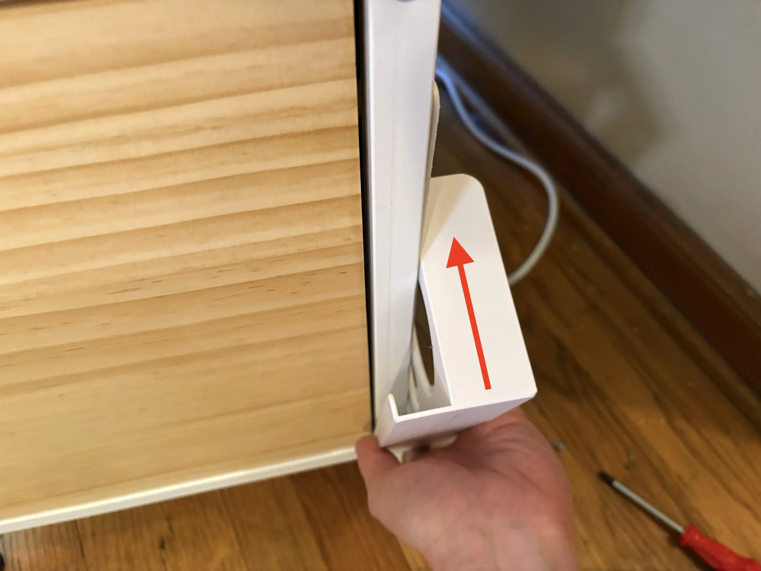 Slide the Power Strip Mount into place. The thin tab on the left slides into the gap between the wood panel and the metal frame.
